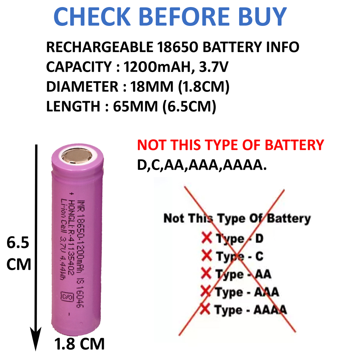 - Note: This is not AA/AAA Battery Kindly Check All Images This Battery Supported Item Visible in Image. If You Not Received This Product as Per Image or Description Urgently Taking Action Contact to Customer Support. This is Lithium Battery 3.7 V Full Capacity 1200 mAH, 4.44WH Size : 6.5 cm X 1.8 cm X 1.8 cm.