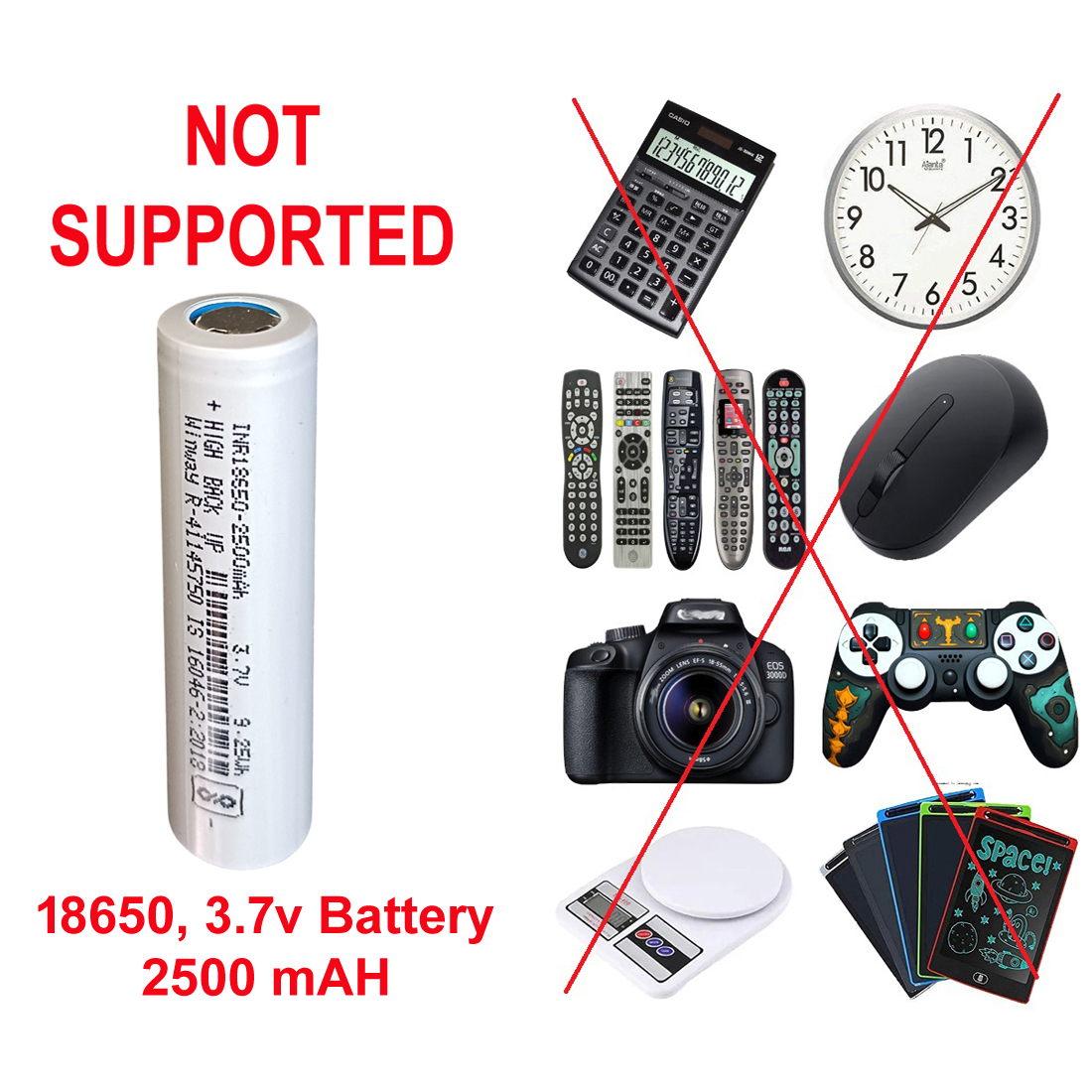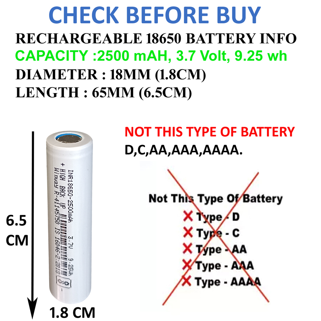 - Note: This is not AA/AAA Battery Kindly Check All Images This Battery Supported Item Visible in Image. If You Not Received This Product as Per Image or Description Urgently Taking Action Contact to Customer Support. This is Lithium Battery 3.7 V Full Capacity 2500 mAH, 8.14WH Size : 6.5 cm X 1.8 cm X 1.8 cm.