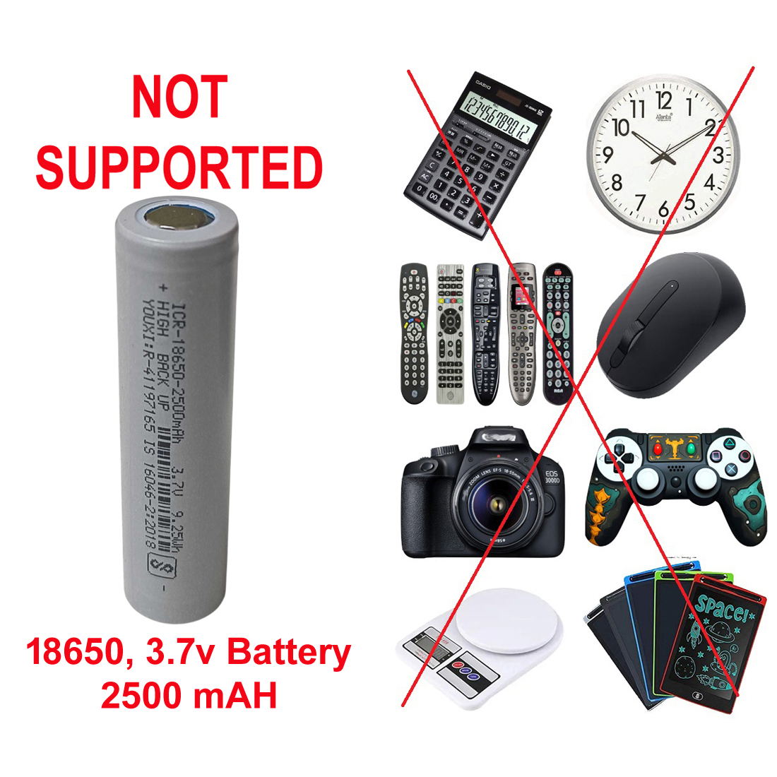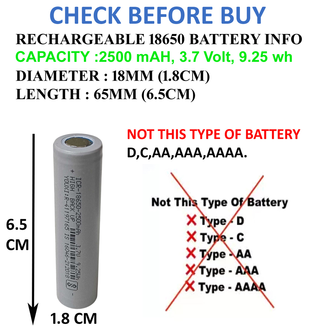 - Note: This is not AA/AAA Battery Kindly Check All Images This Battery Supported Item Visible in Image. If You Not Received This Product as Per Image or Description Urgently Taking Action Contact to Customer Support. This is Lithium Battery 3.7 V Full Capacity 2500 mAH, 8.14WH Size : 6.5 cm X 1.8 cm X 1.8 cm.